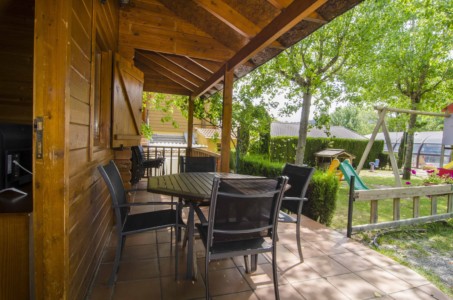 Bungalow Monte Perdido con capacidad de 6 personas: una habitación con cama de matrimonio y literas, salón-cocina con sofá-cama doble, aire acondicionado, cocina completamente equipada con vitrocerámica, microondas y lavavajillas, televisión, baño completo con bañera, porche exterior con mesa y sillas y plaza para el coche delante del bungalow.
